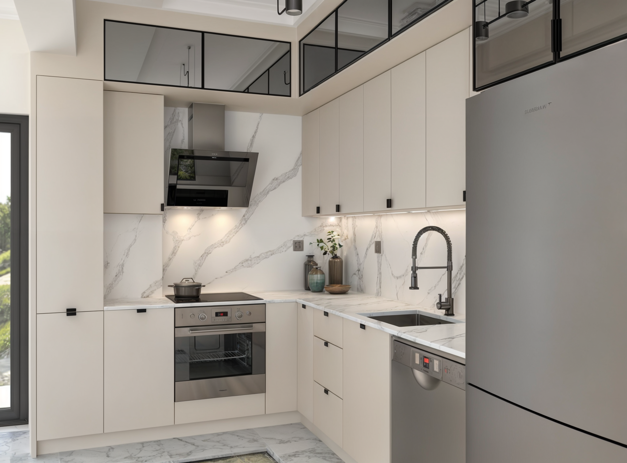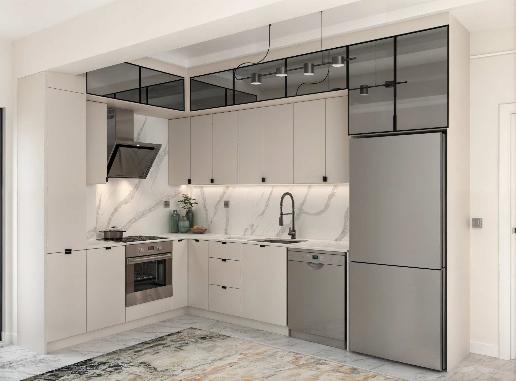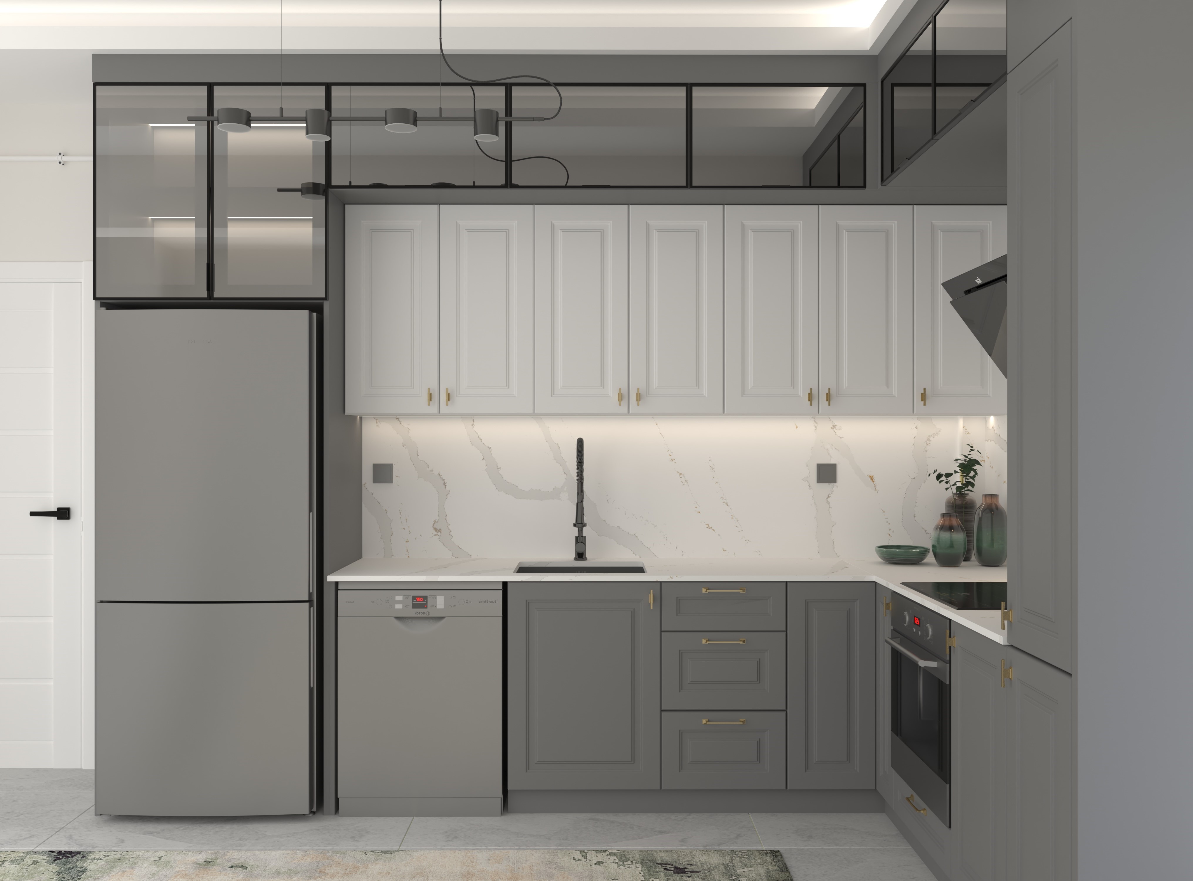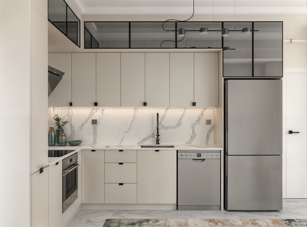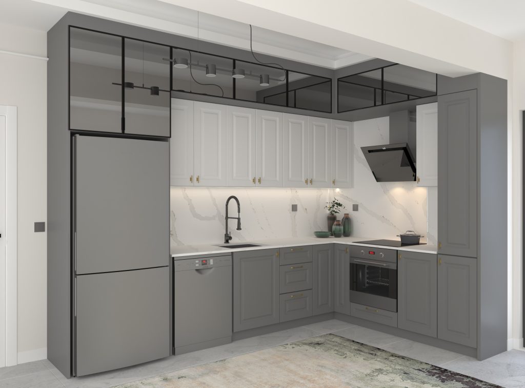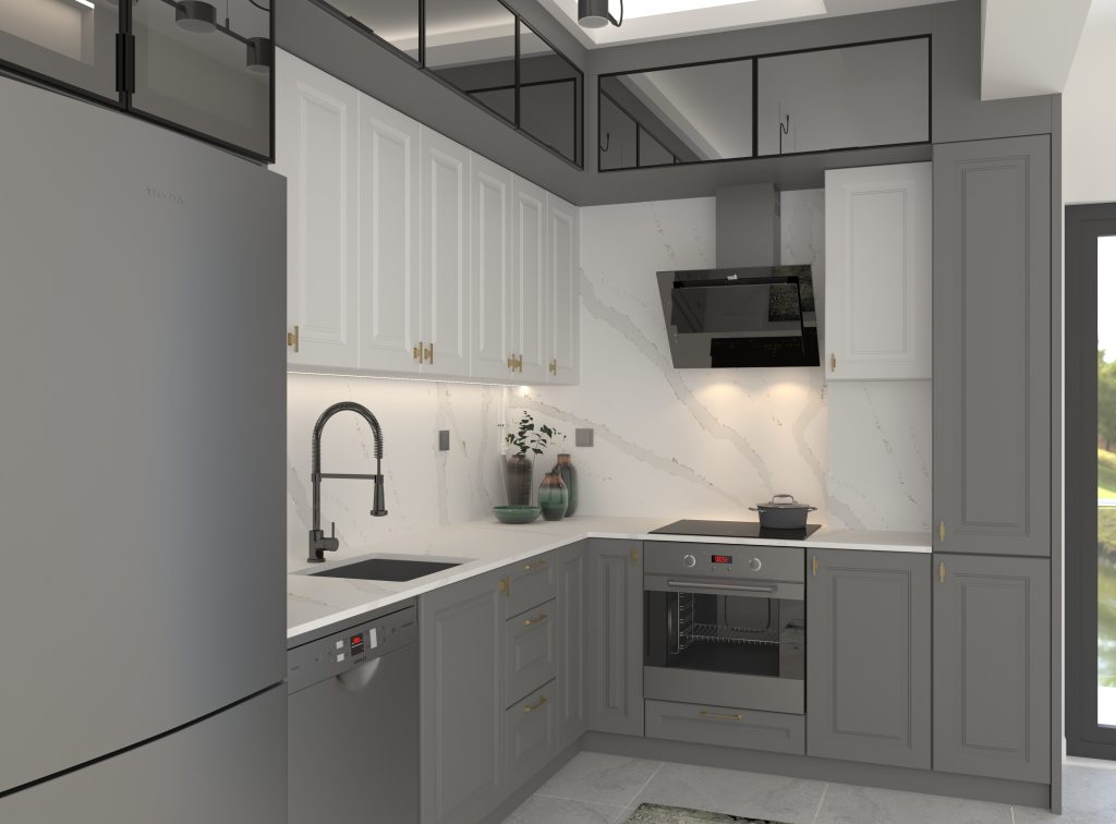Bu tasarım anlayışı, hem estetik hem de pratik açıdan kullanıcı dostu bir mutfak deneyimi sunmayı hedefliyor. Alanın maksimum verimlilikle kullanılmasını sağlayan yerleşim planı, her iki mutfakta da düzenli ve ferah bir ortam yaratıyor